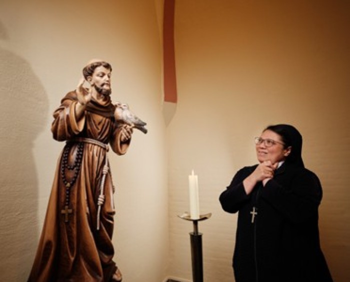 Zuster Reinalda wijst naar de naam van het gastenhuis, het Franciscushuis. Ze vertelt: ‘Franciscus is een profeet van deze tijd, een profeet van alle tijden. Franciscus zei: God is in ieder mens. En zo willen wij mensen hier ontvangen, wij willen gastvrij zijn. Met dit huis kunnen wij iets te betekenen voor de maatschappij, voor de mensen die rust nodig hebben en voor zoekende mensen. Ons motto is: Uit rust komt kracht. Wij hopen dat het Franciscushuis een oase kan zijn voor mensen in deze drukke wereld, dat zij tot rust kunnen komen.’